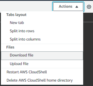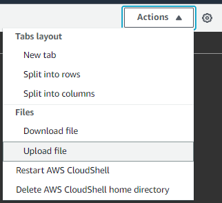 오른쪽 위 'Action'에서 파일 업로드/다운로드가 가능하다. 파일 업로드 시 경로는 /home/cloudshell-user이며 앞서 설명했듯이 각 리전당 영구적으로 1GB를 지원한다고 한다. 세션을 다시 시작해도 파일은 유지되었다. 다운로들 할 때는 CloudShell 내에 위치하고 있는 데이터 파일의 경로를 입력하면 된다. $HOME 이외의 경로는 CloudShell에 나갔다 들어오면 다시 돌아간다.