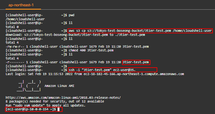 4. 키파일을 Private Bucket에 올리고 CloudShell에서 Private Bucket에 있는 키파일을 다운로드하고 그 키파일로 서버에 접속한다.